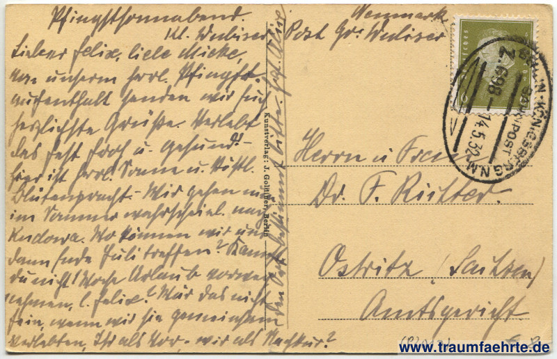 – Details – Jahr: ca. 1930 Status: gelaufen 1932 (Bahnpost) Beschriftung vorne: Berlin-Wilmersdorf. Hohenzollern-Platz Beschriftung hinten: Kunstverlag: J. Goldiner, Berlin Stempel: Bahnpost, Berlin–Königsberg N.M., Z.698 – 14.5.32 Hinweis: