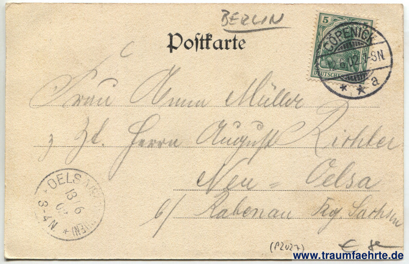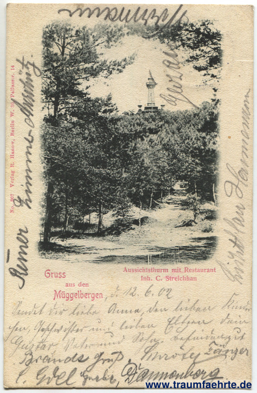 – Details – Jahr: ca. 1900 Status: gelaufen 1902 Beschriftung vorne: Gruss aus den Müggelbergen, Aussichtsthurm mit Restaurant, Inh. C. Streichhan, No. 307 Verlag R. Hanow, Berlin W. 30. Pallastr. 14. Beschriftung hinten: Postkarte Stempel: Cöpenick, * * a, 12.6.02. 7–8N.; Oelsnitz ([…]en), 13 / 6 02, 3–4 N. Hinweis: