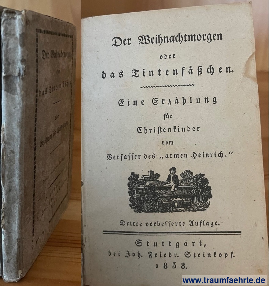 Alte Bücher etc. > Kinderbücher > Jugend & Abenteuer(Möller, Antonie): Der Weihnachtsmorgen oder das Tintenfäßchen. Eine Erzählung für Christenkinder. [ Permalink ]>>> Artikel-Nr: 20294 <<< Stuttgart, Steinkopf 1838, 3., verbesserte Aufl., mit wenigen Holzschnittvignetten, 131 S., OPp., 9,5 x 14 cm Zustand: Einbandkanten berieben, vereinzelte Stockflecken Preis: 75,00 €