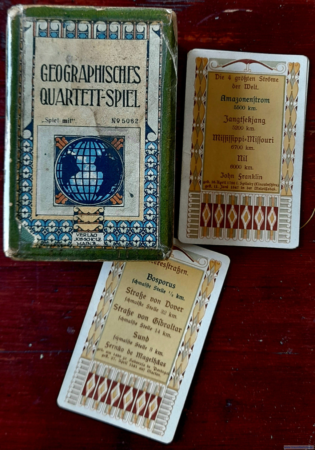 Alte Bücher etc. > Kinderbücher > Spielkarten & SpieleGeographisches Quartett-Spiel. [ Permalink ]>>> Artikel-Nr: 20300 <<< Mainz, Scholz ca. 1920 (= Scholz' künstlerische Spiele "Spiel mit" Nr. 5062), 80 Spielkarten mit Fragen (20 Quartette zu je 4 Karten), mit 1 Spielanleitung, in farb. illustr. Orig.-Schachtel Zustand: seltenes, komplettes Spiel, die Schachtel ist geklebt und berieben, die Karten sind in schönem Zustand Preis: 65,00 €