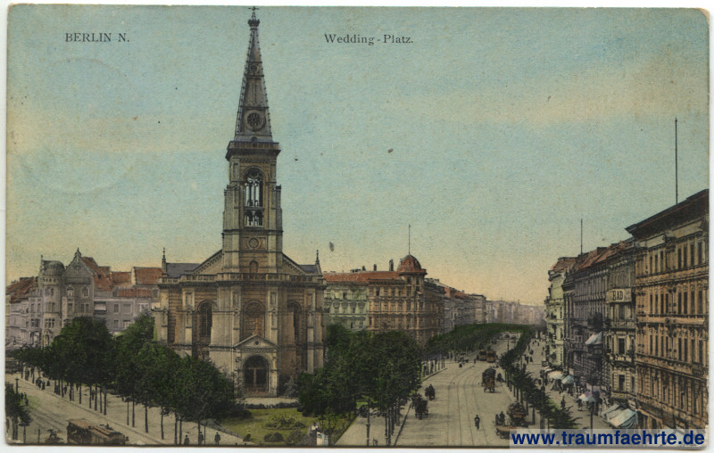 nachkoloriert – Kirche mit Kirchturm, Weddingplatz mit Alleen, Kutschen, Straßenbahnen, Litfaßsäule, Laternen und Passanten; Häuser mit Geschäften rechts und Häuser im Hintergrund
