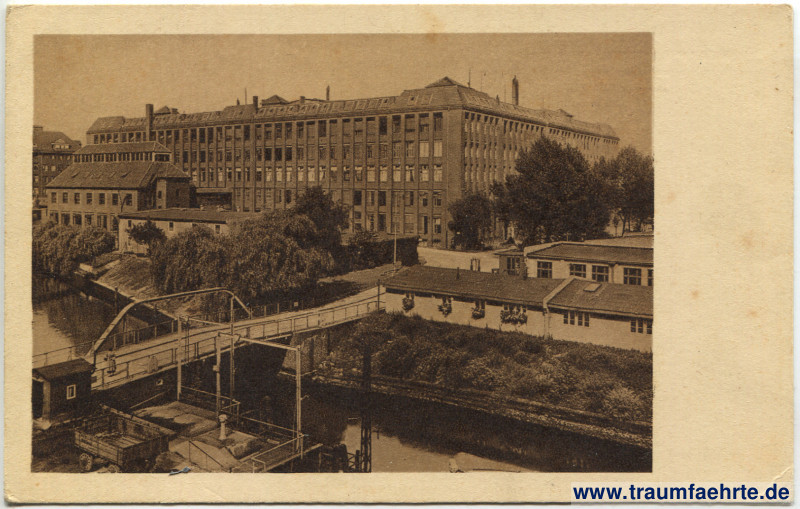 sepiafarben – Spree mit Brücke, Fabrikgelände mit Fabrikgebäuden und Schornsteinen, vereinzelte Bäume [Die Umwandlung der Siemens-Schuckertwerke von einer Gesellschaft mit beschränkter Haftung in eine Aktiengesellschaft erfolgte 1927, weswegen „G.m.b.H.“ per Stempel mit „A.G.“ ersetzt wurde.]