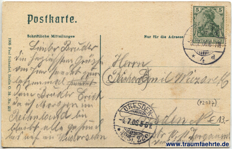 – Details – Jahr: 1905 Status: gelaufen 1906 Beschriftung vorne: Berlin, Hochbahnstation Möckernbrücke Beschriftung hinten: Postkarte. 1905 Paul Schnabel, Berlin O. 34. No. 221. Schriftliche Mitteilungen, Nur für die Adresse Stempel: [Berlin] N., * 4 d, -3.7.06. 6–7N.; Dresden-Neust. 22c, -4.7.06. 5–6V. Hinweis: