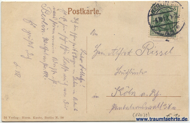 – Details – Jahr: ca. 1910 Status: gelaufen 1912 Beschriftung vorne: Berlin. Dönhoffsplatz. W. Kersten, Photogr. Atelier Beschriftung hinten: Postkarte. 24 Verlag: Herm. Kaute, Berlin N. 58. Stempel: Berlin […], * 48 […], -4.10.12 1–2[…] Hinweis: