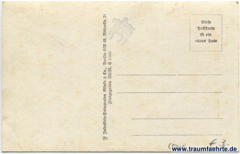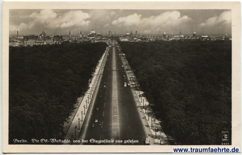 – Details – Jahr: ca. 1940 Status: ungelaufen Beschriftung vorne: Berlin. Ost-Westachse, von der Siegessäule aus gesehen. Klink & Co, Berlin W […], B489 Beschriftung hinten: Fε, Industrie-Fotografen Klinke & Co., Berlin GW 68, Ritterstr. 23. Freigegeben RLM. E 15819. Diese Postkarte ist ein echtes Foto Stempel: […] Hinweis: