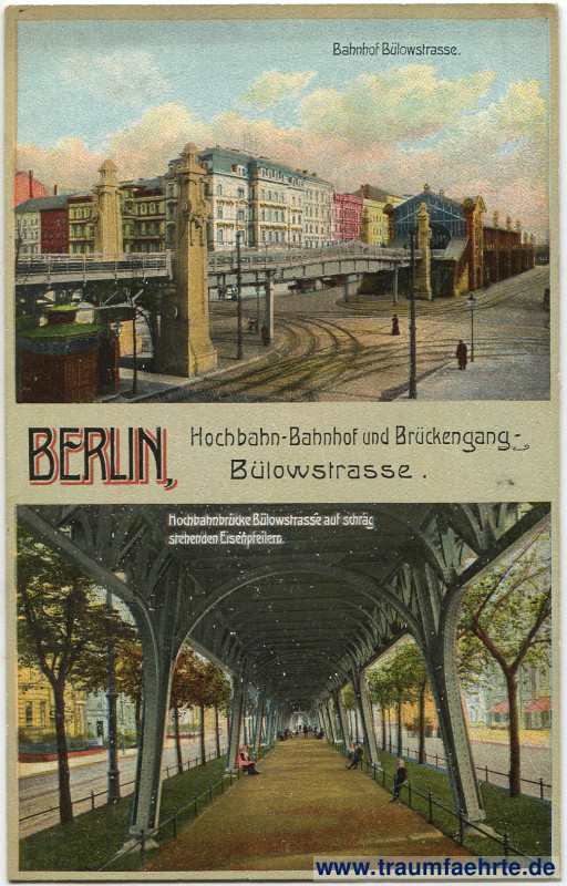 Beschriftung vorne: Berlin, Hochbahn-Bahnhof und Brückengang – Bülowstrasse. Bahnhof Bülowstraße. Hochbahnbrücke Bülowstrasse auf schräg stehenen Eisenüpfeilern.