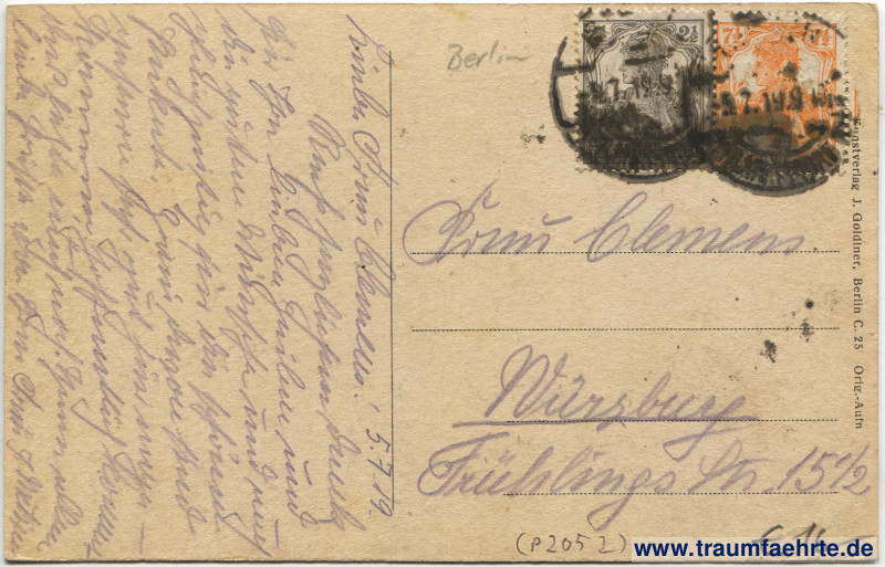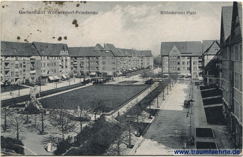– Details – Jahr: ca. 1915 Status: gelaufen 1919 Beschriftung vorne: Gartenstadt Wilmersdorf–Friedenau. Rüdesheimer Platz. Beschriftung hinten: Kunstverlag J. Goldner, Berlin C. 25 Orig.-Aufn Stempel: 2x […], 5.7.19 [9–10…] Hinweis: