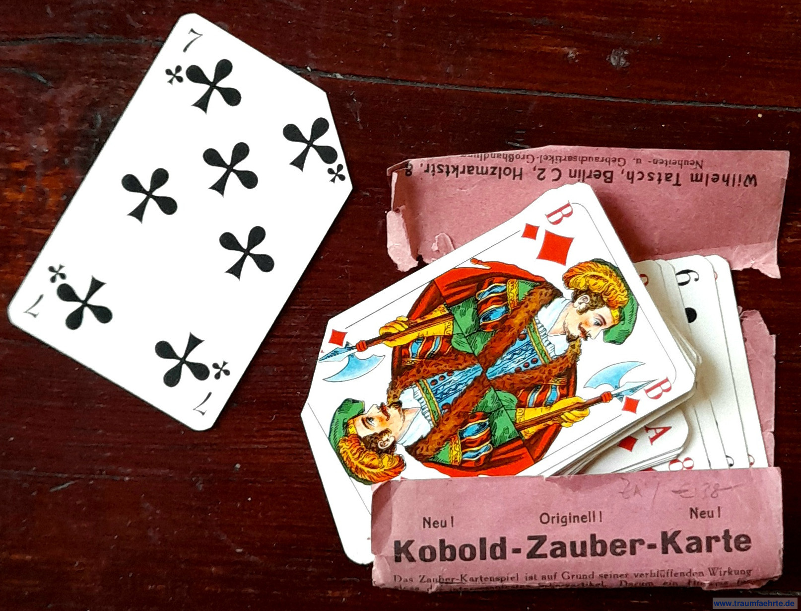 Alte Bücher etc. > Spielkarten & Spiele > VerschiedenesKobold-Zauber-Karte. [ Permalink ]>>> Artikel-Nr: 20629 <<< Berlin, Tatsch ca. 1925, 32 Spielkarten, französisches Blatt mit unterschiedlich abgeschrägten Ecken (Zaubervarianten), mit Spielanleitung mit 8 Tricks, kein Karton Zustand: Spielanleitung randrissig, Karten tadellos Preis: 38,00 €