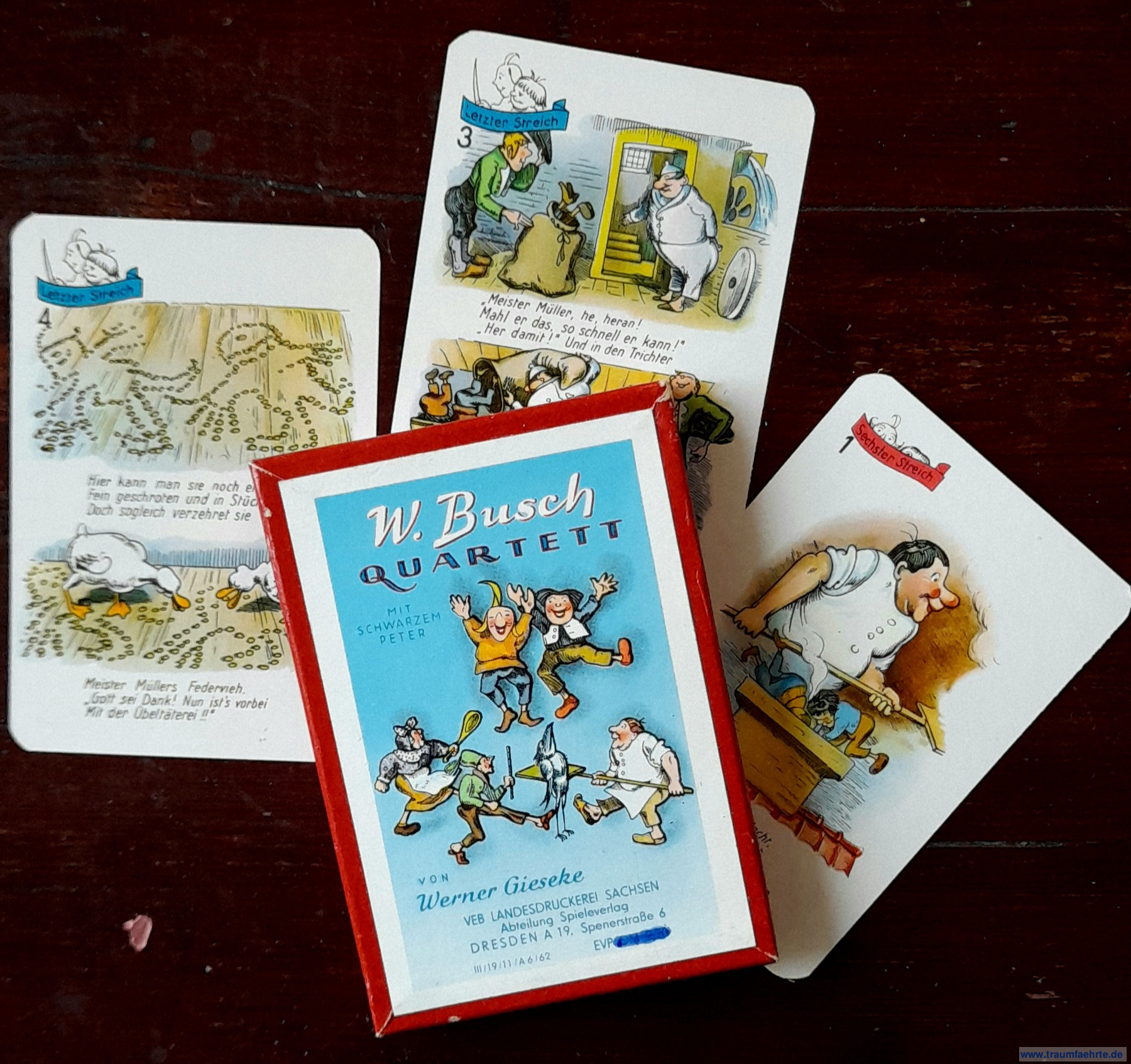 Alte Bücher etc. > Spielkarten & Spiele > VerschiedenesGieseke, Werner: Wilhelm Busch Quartett mit Schwarzer Peter. [ Permalink ]>>> Artikel-Nr: 20630 <<< Dresden, Landesdruckerei (1962), 32 farb. illustr. Karten (8 Quartette), 1 Karte Schwarzer Peter, 1 Karte Spielanleitung in farb. illustr. Orig.-Schachtel Zustand: die Schachtel hat wenige Lagerspuren, schönes, unbespieltes Kartenspiel Preis: 35,00 €