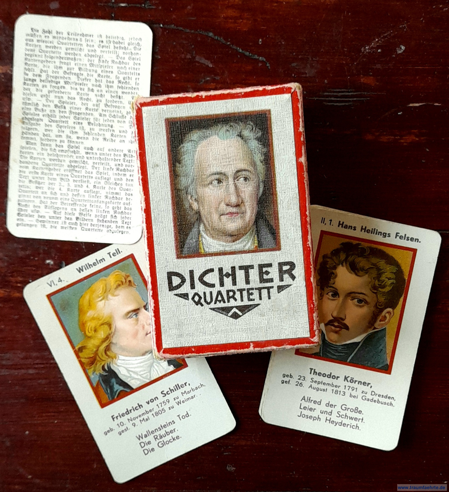 Alte Bücher etc. > Spielkarten & Spiele > VerschiedenesDeutsche Dichter. Ein Quartettspiel. [ Permalink ]>>> Artikel-Nr: 20631 <<< anonym ca. 1925, komplettes Spiel mit 24 Spielkarten u. farb. Dichter-Abbildungen, mit Spielanleitung – alles in farb. illustr. Orig.-Pappschachtel Zustand: Schachtel berieben Preis: 35,00 €