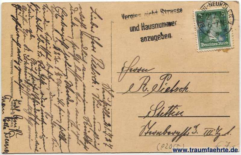 Stempel: Berlin–Neukölln, s, 21 7 27, 6–7 N; Vergiss nicht Strasse und Hausnummer anzugeben.
