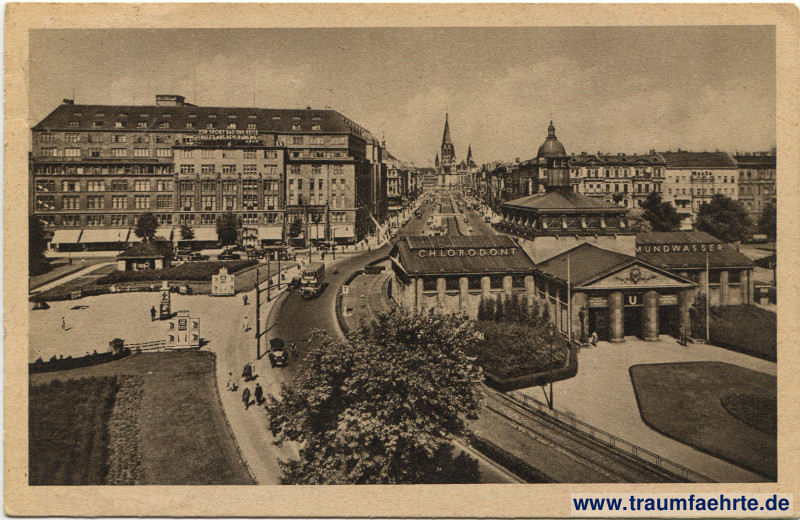 sepia-coloured monochrome photograph – park and U-Bahn station with advertisement in front, alley with oldtimers, bus, lanterns, advertising column, and pedestrians; church and towers in background
