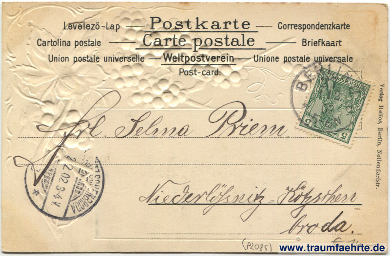 – Details – Jahr: ca. 1900 Status: gelaufen 1902 Beschriftung vorne: Berlin, Spittelmarkt Beschriftung hinten: Levelezö-Lap – Postkarte – Correspondenzkarte, Cartolina postale – Carte postale – Briefkaart, Union postale universelle – Weltpostverein – Unione postale universale, Post-card. Verlag Helios, Berlin, Nollendorfstr. Stempel: Berlin O. 27, 1 / 2 02 5–6 N; Kötzschenbroda, […] *, 2.2.02. 3–4 V. Hinweis: