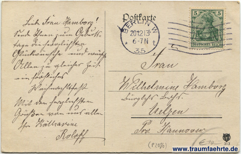 – Details – Jahr: ca. 1910 Status: gelaufen 1913 Beschriftung vorne: Berlin, Spittelmarkt, Sinalco (alkoholfrei), Bilz-Brause, Menzenhauer, 14a, Musikhaus Menzenhauer, Hartwig & Vogel, Richter & Franke, […] Beschriftung hinten: VO 313 Stempel: Berlin W, * 35 t, 20 12 13, 6–7 N Hinweis: