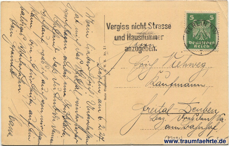 Postmark(s): Berlin NW, […], 6.2.27 7–8N; Vergiss nicht Strasse und Hausnummer anzugeben.