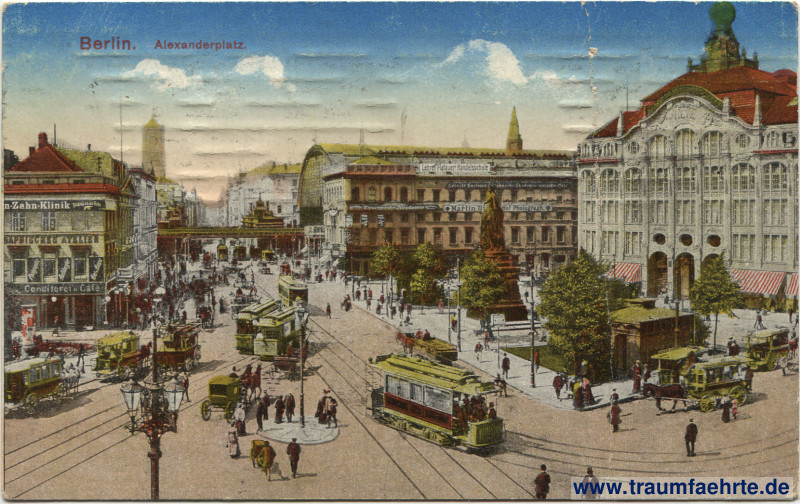 nachkoloriert – belebter Alexanderplatz mit Kaufhaus Tietz, Werbung, Statue, Straßenbahnen, Kutschen, Laternen, Litfaßsäule und Passanten; Brücke und Türme im Hintergrund