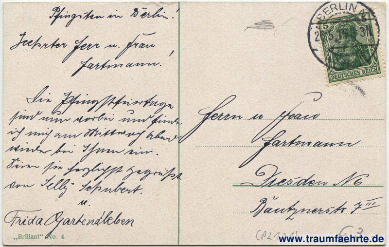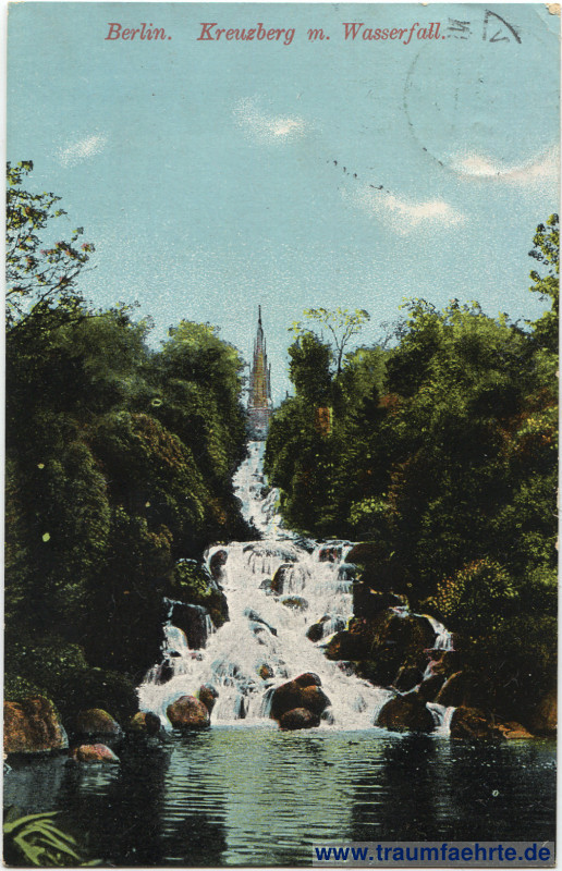 – Details – Year: ca. 1910 Postal state: postally used 1915 Inscription front: Berlin. Kreuzberg m. Wasserfall. Inscription back: „Brillant“ No. 4 Postmark(s): Berlin N, * […], 26.5.15 2–3 N. Please note: