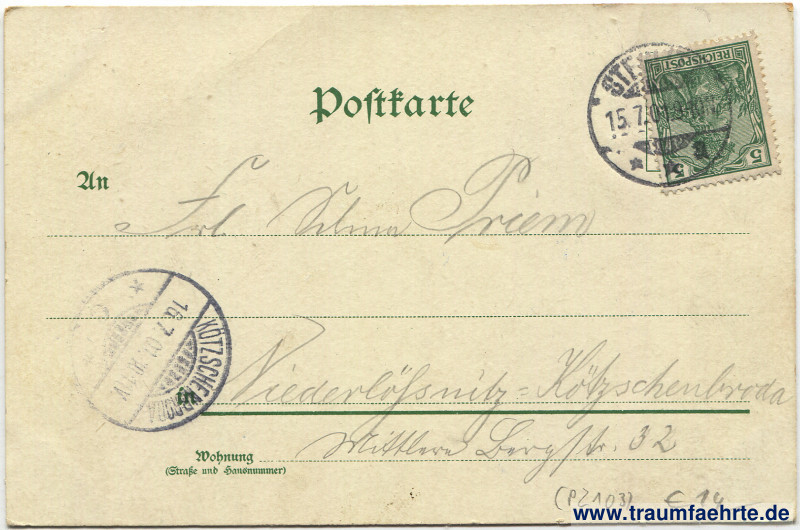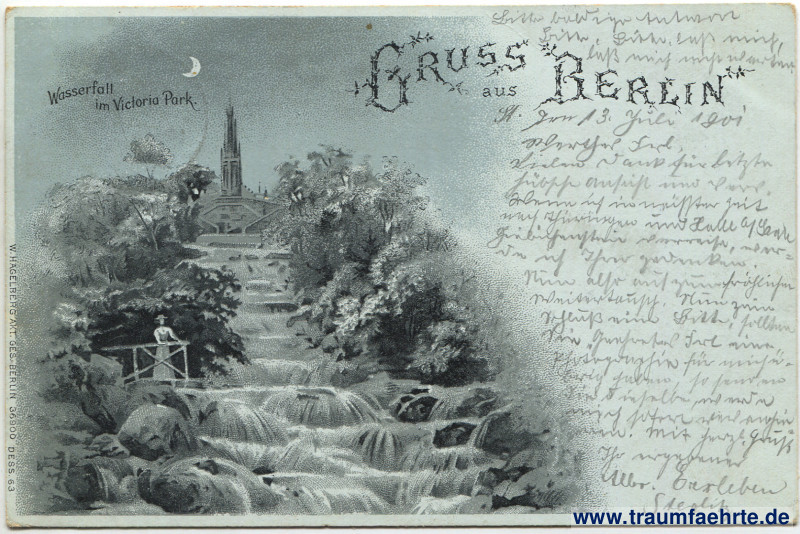 – Details – Year: ca. 1900 Postal state: postally used 1901 Inscription front: Gruss aus Berlin, Wasserfall im Victoria Park. W. Hagelberg Akt. Ges. Berlin 36900 Dess. 63 Inscription back: Postkarte. An … in … Wohnung (Straße und Hausnummer) … Postmark(s): Ste[glitz], * * a, 15.7.01. 9–10N; Kötzschenbroda, * […], 16.7.01. 10–11 V. Please note: