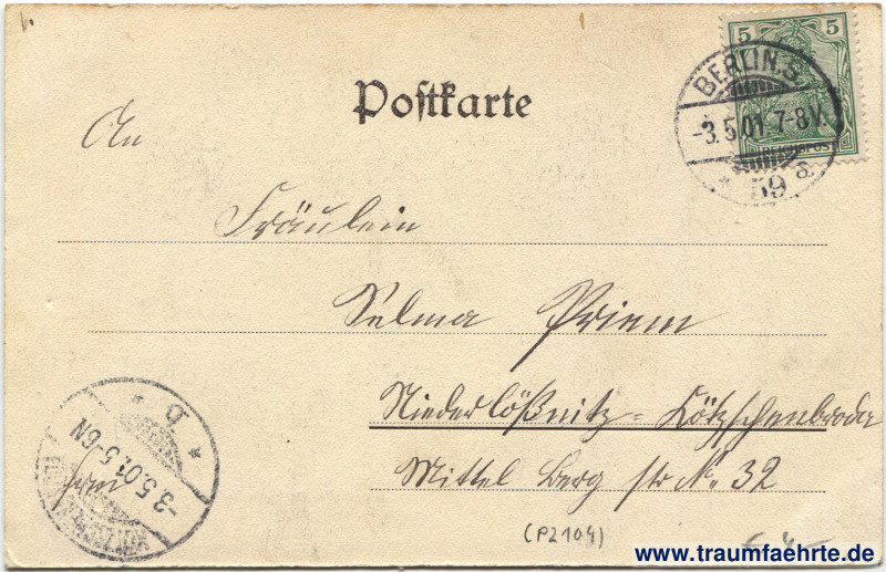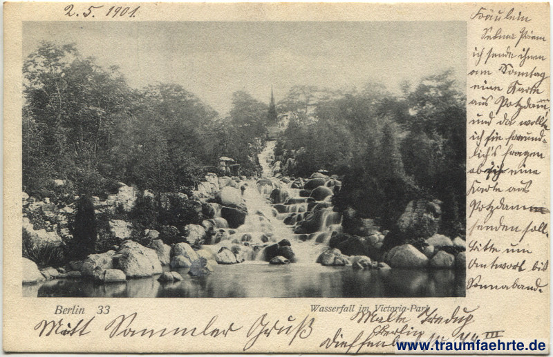 – Details – Year: ca. 1900 Postal state: postally used 1901 Inscription front: Berlin, 33, Wasserfall im Victoria-Park Inscription back: Postkarte Postmark(s): Berlin. S., * 59 a, -3.5.01. 7–8 V; Kötzschenbroda, * b *, -3.5.01. 5–6 N Please note: