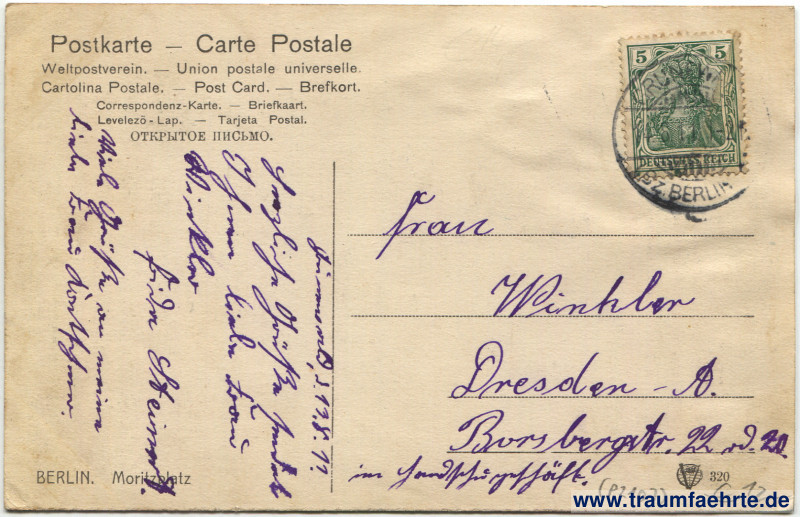 – Details – Jahr: ca. 1910 Status: gelaufen 1911 Beschriftung vorne: Loeser & Wolff Leihaus Moritzplatz, Loeser & Wolf, Moebel Boebel, Wohnungs-Einrichtungen, Möbel-Fabrik J. Boe, Parfümerie Moritzplatz, Max Eckard, Eduard Palm, Victoria Versicherungen, Gawenda Pianos, Damen-Mäntel, Julius Schulke, Färbere[i], H. Falke, […] Beschriftung hinten: Berlin. Moritzplatz. Postkarte – Carte , Weltpostverein. – Union postale universelle. Cartolina Postale. – Post Card. – Brefkort. Correspondenz-Karte. – Briefkaart., Levelezö-Lap. – Tarjeta Postal. ОТКРЫТОЕ ПИСЬМО. Stempel: Grunewald, Bz. Berlin, 14.8.11, 1–2 […] Hinweis: