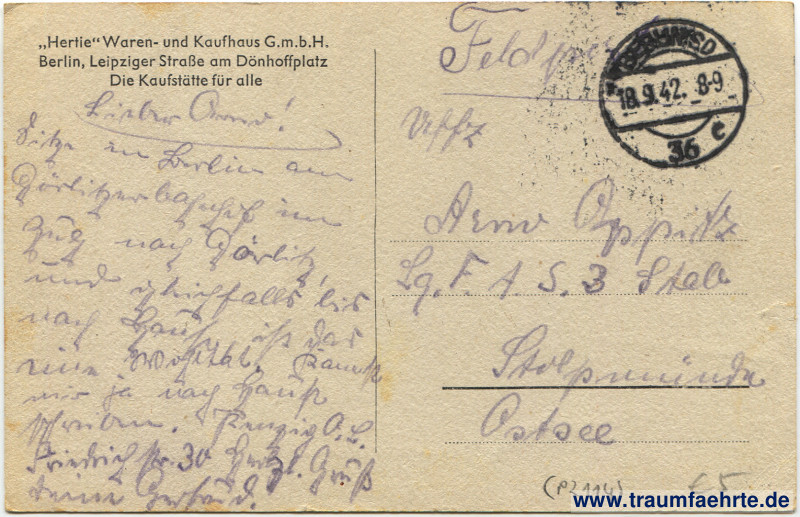 – Details – Year: ca. 1940 Postal state: postally used without stamp (military mail), 1942 Inscription front: „Hertie“ Berlin, Leipziger Straße am Dönhoffplatz, 8x Hertie Inscription back: „Hertie“ Waren- und Kaufhaus G.m.b.H. Berlin, Leipziger Straße am Dönhoffplatz, Die Kaufstelle für alle Postmark(s): Berlin SO, 36 c, 18.9.42. 8–9 […] Please note: