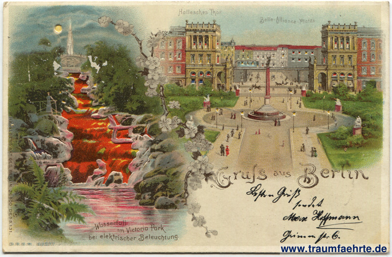 – Details – Jahr: ca. 1900 Status: gelaufen 1901 Beschriftung vorne: Gruss aus Berlin, Wasserfall im Victoria-Park bei elektrischer Beleuchtung, Hallesches Thor, Belle-Alliance-Platz, W. Hagelberg Akt. Ges. Berlin 36900 Dess. 131. D. R. G. M. 88077 Beschriftung hinten: Postkarte. An … in … Wohnung (Straße und Hausnummer) … Stempel: 3x Berlin. S., * 42 c, 1.7.01. 12–1 V.; Kötzschenbroda, * c *, 1.7.01. 10–11 V Hinweis: