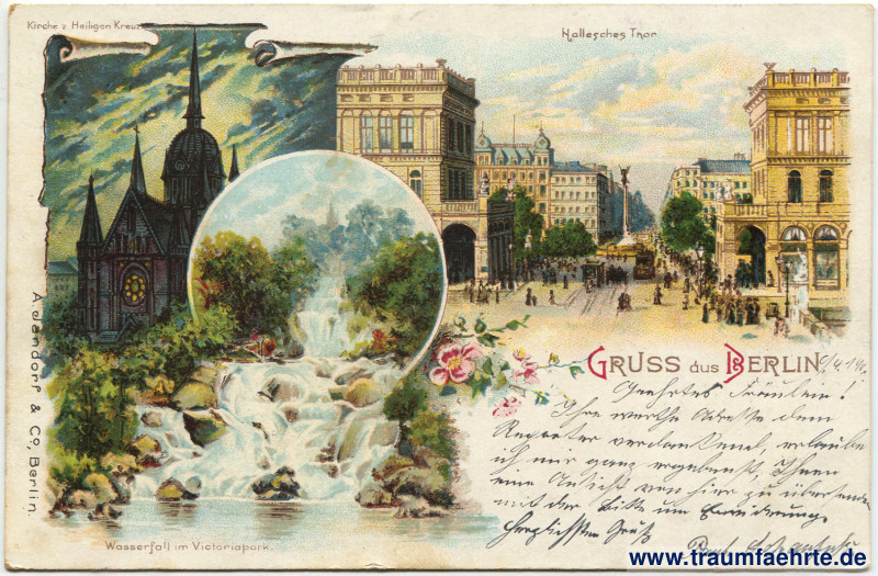 Inscription front: Gruss aus Berlin, Wasserfall im Victoriapark. Kirche z. Heiligen Kreuz. Hallesches Thor. A. Jandorf & Co., Berlin.