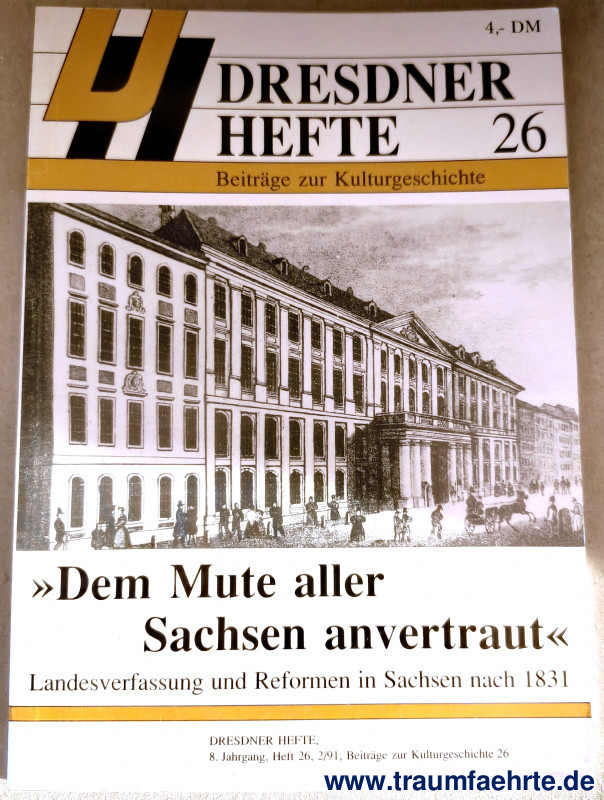 Alte Bücher etc. > SachsenDresdner Geschichtsverein e.V. (Hrsg.): Dresdner Hefte 26. Dem Mute aller Sachsen anvertraut. Landesverfassung und Reformen in Sachsen nach 1831. [ Permalink ]>>> Artikel-Nr: 21350 <<< Dresden, Dresdner Geschichtsverein e.V. 1991, mit Abbildungen, 88 S., illustr. OBro., ISBN 3-910055-10-9 Zustand: ordentliches Exemplar Preis: 6,00 €