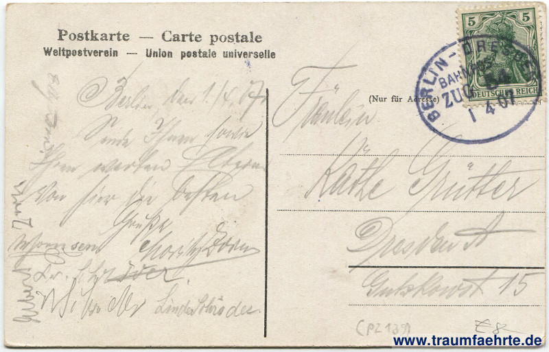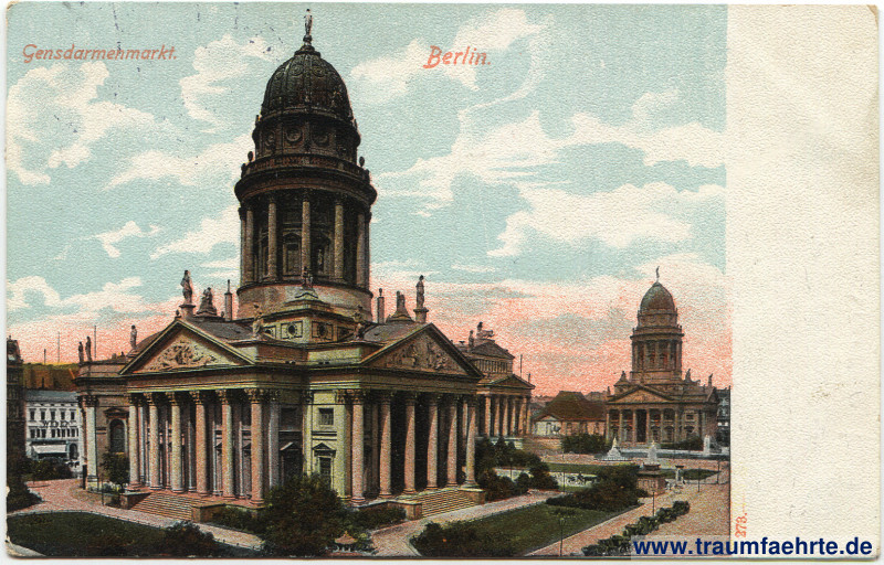 – Details – Jahr: ca. 1905 Status: gelaufen 1907 (Bahnpost) Beschriftung vorne: Berlin. Gendarmenmarkt. 273. Beschriftung hinten: Postkarte – Carte Postale, Weltpostverein – Union postale universelle Stempel: Berlin – Dresden, Bahnpost, Zug 54, 1 4 07 Hinweis: