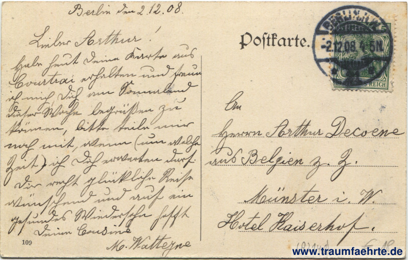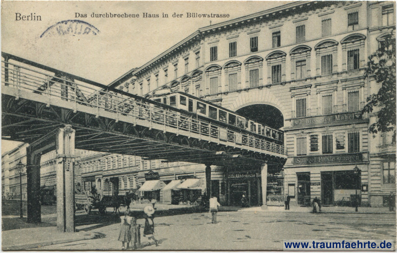 – Details – Jahr: ca. 1905 Status: gelaufen 1908 Beschriftung vorne: Berlin, Das durchbrochene Haus in der Bülowstrasse, E. Gieseler Möbel, Spiegel, Polsterwaren, […] Beschriftung hinten: Postkarte. 109 Stempel: Berlin N.W., * 21 […], -2.12.08. 4–5 N. Hinweis: