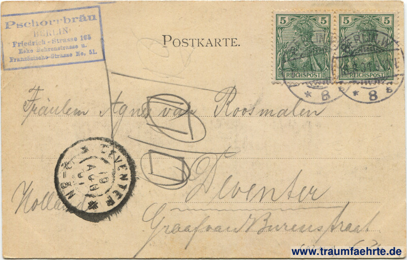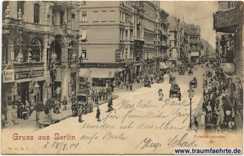 – Details – Jahr: ca. 1900 Status: gelaufen 1901 Beschriftung vorne: Gruss aus Berlin, Friedrichstrasse, W. G. B. 5, Kaiser Hotel, […] Pietzner […] Hofpgotograph, Gustav Baum, Wilhelma in Magdeburg, […] Beschriftung hinten: Postkarte. Stempel: 2x Berlin W., * 8 g, 18.8.01 9–10 N.; […]evente[…], 19 Aug 01, 2–3 N; Pschorrbräu Berlin, Friedrich-Strasse 165, Ecke Behrenstrasse u. Französische-Strasse No, 51. Hinweis: