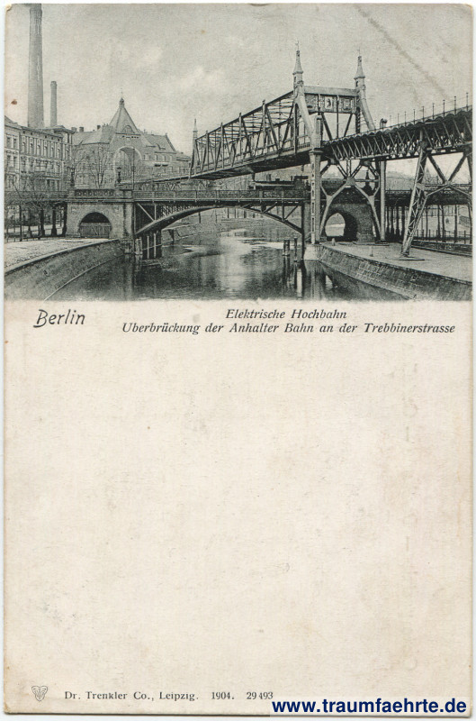 – Details – Jahr: 1904 Status: ungelaufen Beschriftung vorne: Berlin, Elektrische Hochbahn, Überbrückung der Anhalter Bahn an der Trebbinerstrasse, D T Co, Dr. Trenkler Co., Leipzig. 1904. 29 493 Beschriftung hinten: Carte postale – Postkarte – Cartolina postale – Dopisnice, Открытое-письмо – Post card – Levelezö-Lap – Briefkaart. Stempel: keine Hinweis: