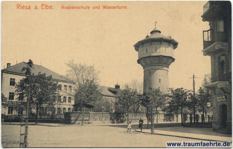 Beschriftung vorne: Riesa a. Elbe. Knabenschule und Wasserturm.