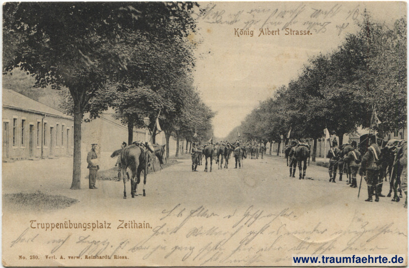 – Details – Jahr: ca. 1900 Status: gelaufen 1904 Beschriftung vorne: Truppenübungsplatz Zeithain. König Albert Straße. No. 280. Verl. A. verw. Reinhardt, Riesa. Beschriftung hinten: Postkarte. Stempel: Zeithain-Übungsplatz, * a, 29.6.04 2–3 N.; Schlegel-Burkersdorf, 30.6.04 8–9 V Hinweis: