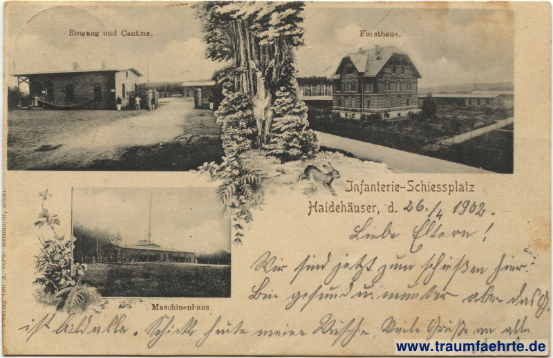 Beschriftung vorne: Infanterie-Schiessplatz Haidehäuser, d. … Eingang und Cantine. Forsthaus. Maschinenhaus.