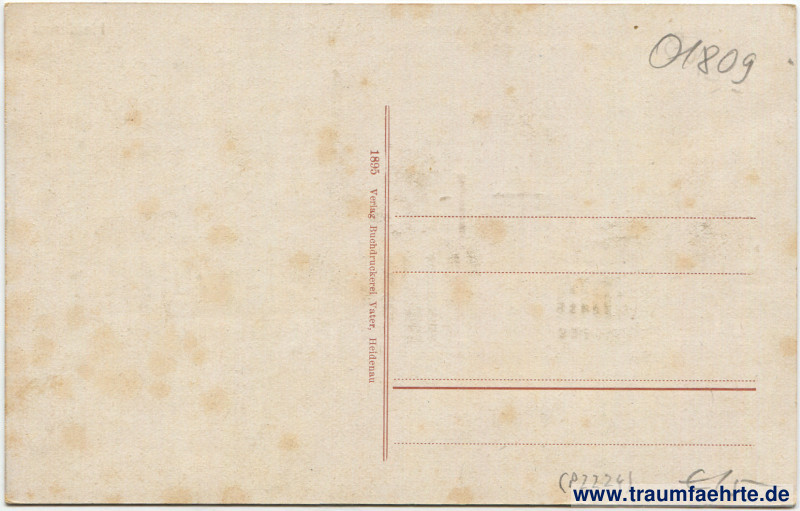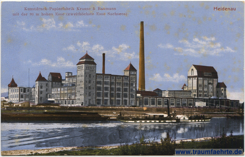 – Details – Jahr: ca. 1925 Status: ungelaufen Beschriftung vorne: Heidenau, Kunstdruck-Papierfabrik Krause & Baumann mit der 93 m hohen Esse (zweithöchste Esse Sachsens) Beschriftung hinten: 1895 Verlag Buchdruckerei Vater, Heidenau Stempel: keine Hinweis: