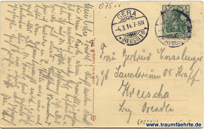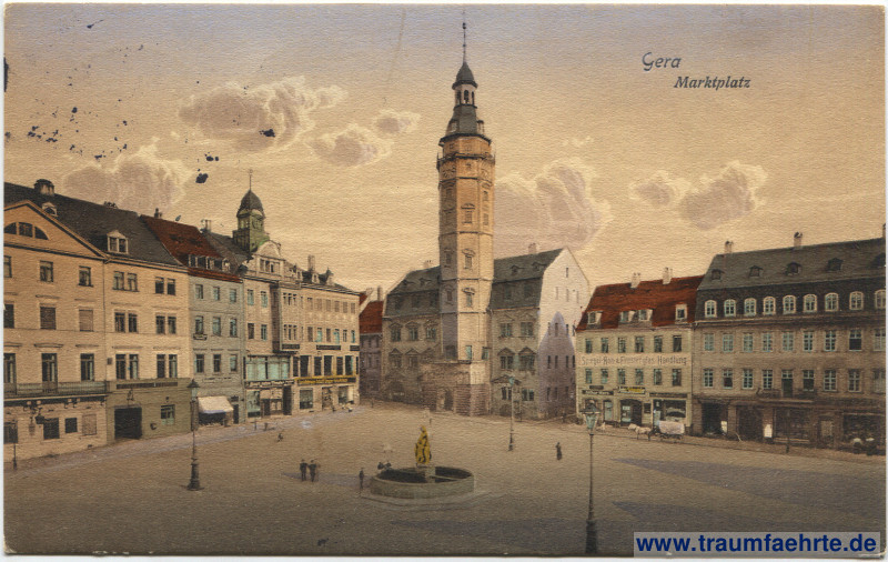 – Details – Year: ca. 1910 Postal state: postally used 1914 Inscription front: Gera, Marktplatz Inscription back: T Co. Trenkler & Co., Leipzig-Str. Nr. 6 Postmark(s): 2x Gera (Reuss), * 1, -4.3.14. 7–8 N Please note: