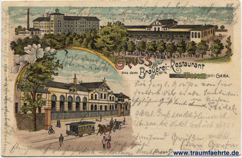 Beschriftung vorne: Gruss aus dem Brauerei-Restaurant Tinz bei Gera. Gerth & Oppenrieder, Gera, Reuss. 2502