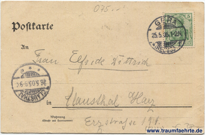 Stempel: Gera (Reuss), * 1, 25.5.05 1–2 N.; Clausthal, * * a, 26.5.05 8–} V