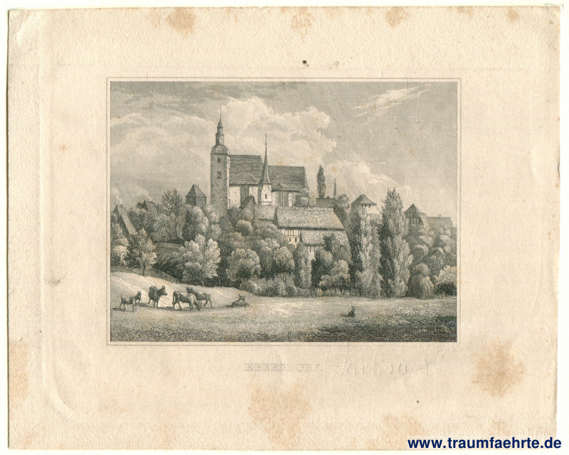 Original: Stahlstich – Panorama des Stiftsareals in Chemnitz–Ebersdorf, mit Kirche und Türmen, umgeben von Bäumen und vereinzelten Häusern; Wiese mit Mensch, Kühe und Ziege im Vordergrund