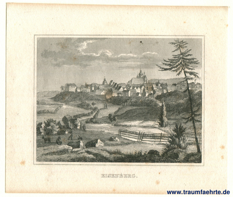 Original: Stahlstich – Panorama von Eisenberg auf Hügel mit Kirchen und Türmen; Fluss, Zaun, Mensch mit Sense, Hund und Ziegen im Vordergrund