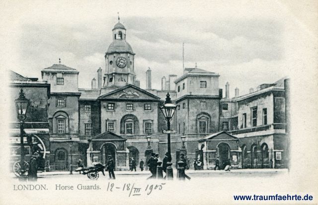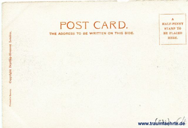 – Details – Year: ca. 1900 Postal state: postally unused Inscription front: London. Horse Guards. Inscription back: Post Card. The address to be written on this side. A half-Penny stamp to be placed here. Printed in Saxony. Copyright Deyring-Honnest, London. Postmark(s): none Please note:
