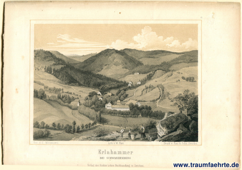 – Details – Jahr: ca. 1860 Beschriftung: Erlahammer bei Schwarzenberg. Gez. v. C. Mittenzwei. Lith. v. W. Rau. Druck v. Rau & Sohn, Dresden. Hinweis: