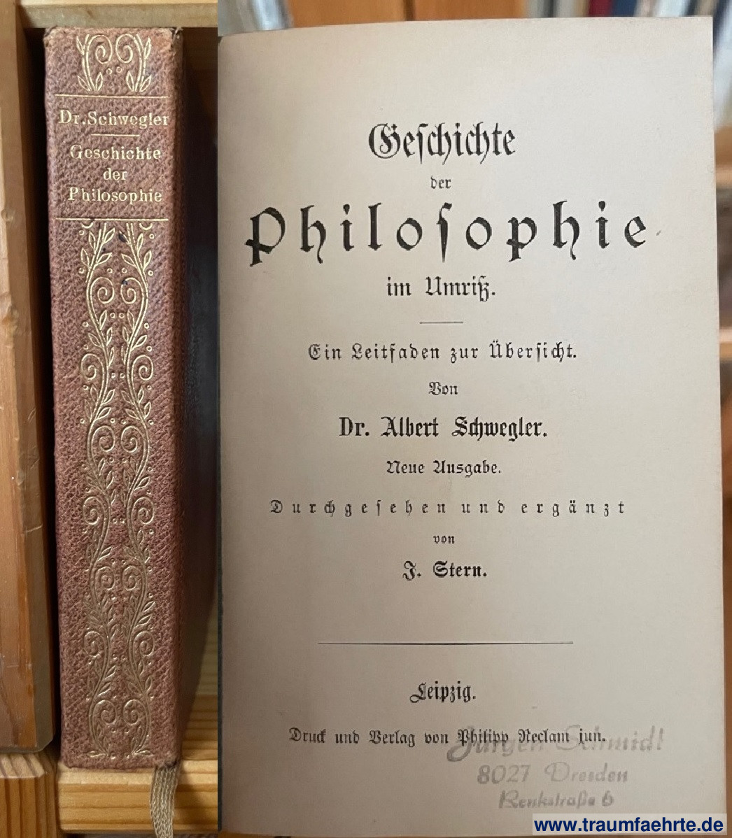 Alte Bücher etc. > Philosophie > Neunzehntes JahrhundertSchwegler, Albert: Geschichte der Philosophie im Umriß. Ein Leitfaden zur Übersicht. Neue Ausgabe. Durchgesehen und ergänzt von J. Stern. [ Permalink ]>>> Artikel-Nr: 23670 <<< Leipzig, Reclam ca. 1900, 512 S., 31 S. – Überblick über Reclam-Ausgaben, goldgeprägtes OLn. (braune Reihe), kleinoktav, marmorierter Buchschnitt Zustand: Rückenkanten gering berieben, schönes Exemplar Preis: 11,00 €