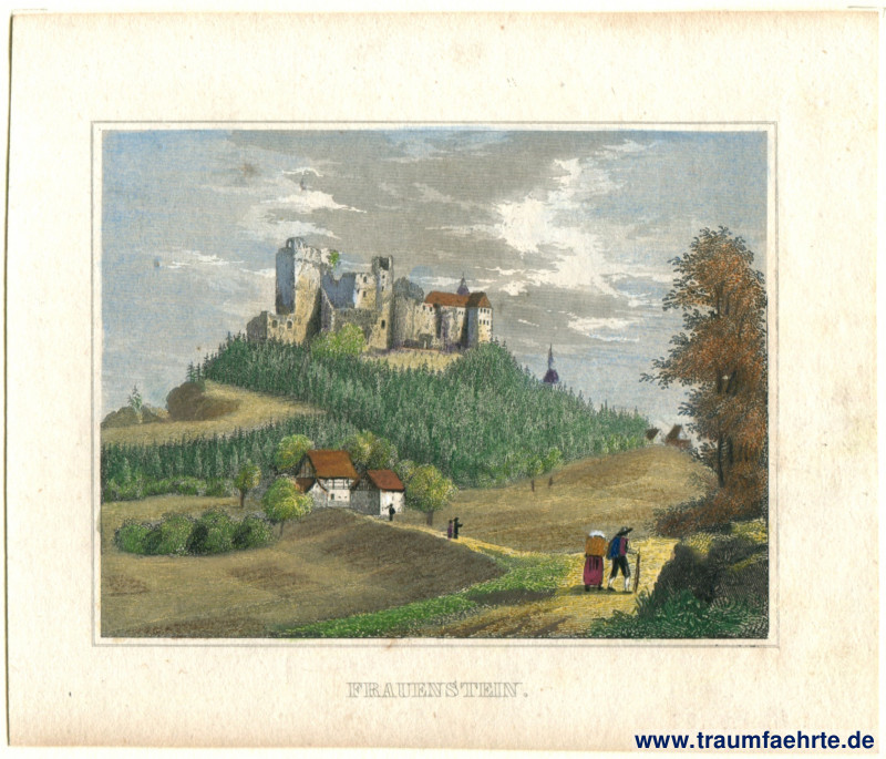 Original: kolorierter Stahlstich – bewaldeter Hügel mit Burgruine und Schloss Frauenstein auf der Spitze; zwei Häuser und vereinzelte Menschen im Vordergrund