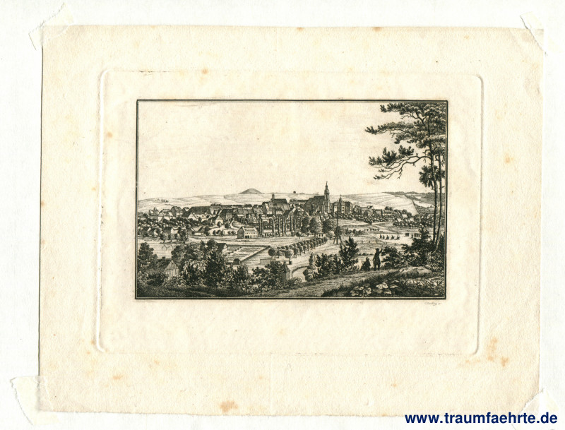 Original: Kupferstich – Panorama von Freiberg mit Kirchen; Felder, Reiter, Büsche, Bäume und zwei Menschen im Vordergrund