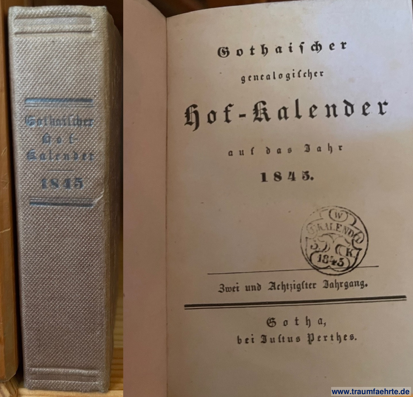Alte Bücher etc. > Geschichte > Genealogie & HeraldikGothaisches genealogisches Hof-Kalender auf das Jahr 1845. 82. Jahrgang. [ Permalink ]>>> Artikel-Nr: 23889 <<< Gotha, Perthes 1844, mit 6 Stahlstich-Porträts, 644 S., geprägter OLn.., 7,5 x 11 cm Zustand: Bund gelockert, Einbandfarbe verblichen Preis: 32,00 €