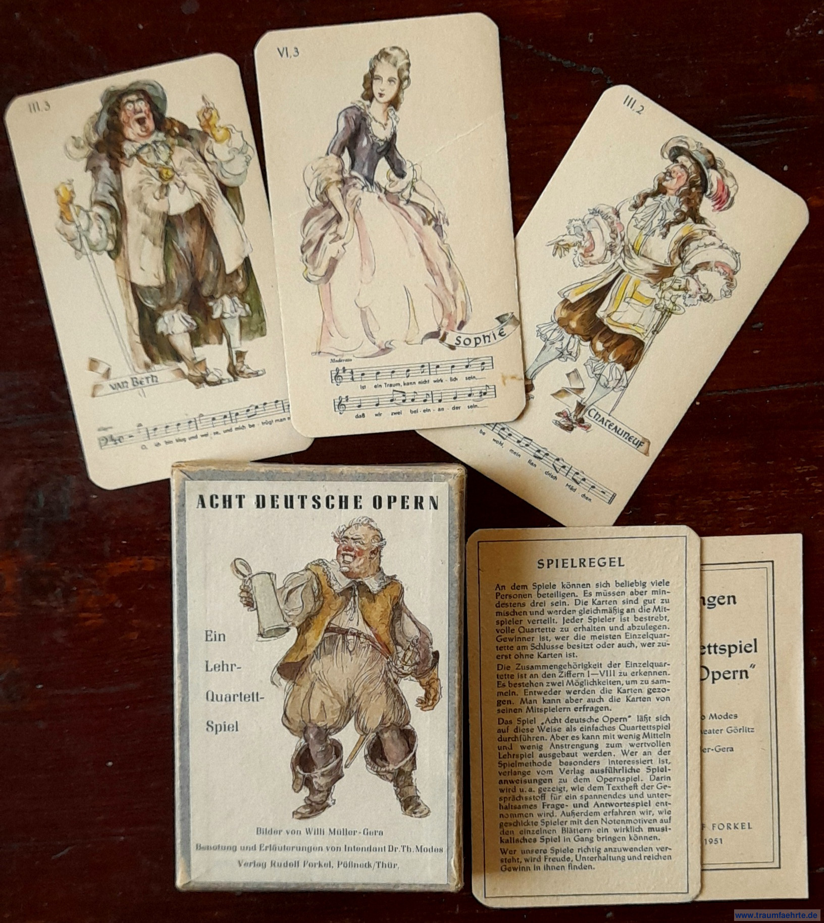 Alte Bücher etc. > Kinderbücher > Spielkarten & SpieleAcht deutsche Opern. Ein Lehr-Quartett-Spiel. [ Permalink ]>>> Artikel-Nr: 23933 <<< Pössneck, Forkel 1951, 32 Spielkarten mit farb. Bildern von Willi Müller-Gera, 1 Spielanleitung, 1 Erläuterungsheft (14 S.), alles in farb. illustr. Orig.-Schachtel Zustand: Schachtel etwas berieben Preis: 48,00 €
