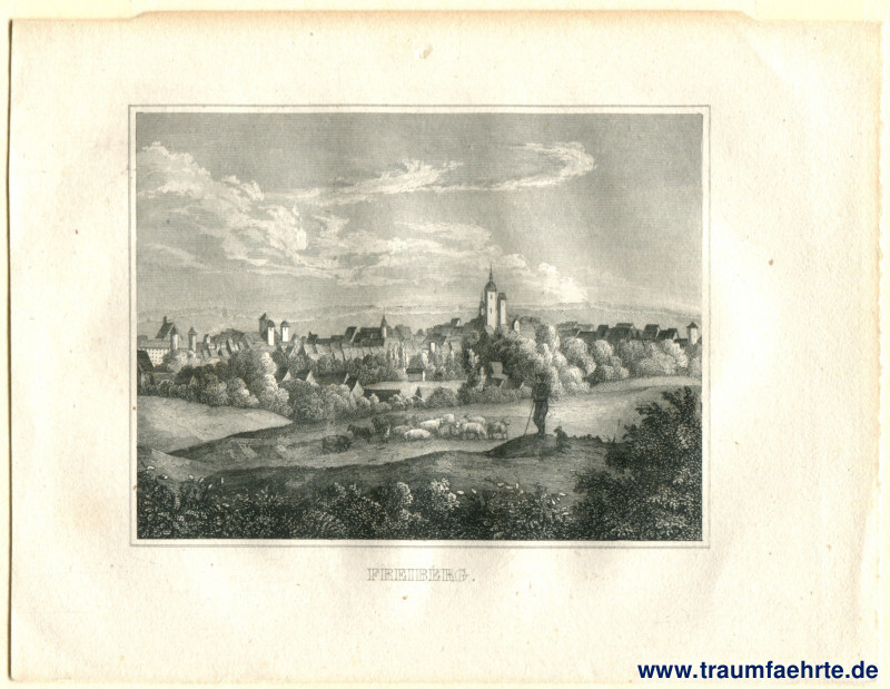 Original: Stahlstich – Panorama von Freiberg mit Kirche, Türmen und Bäumen; Büsche, Hirte und Schafe im Vordergrund