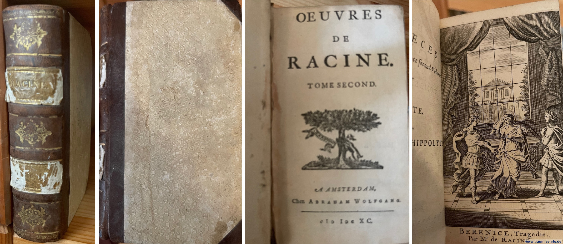 Racine, Jean: Oeuvres de Racine (7 Bände Tragödien in einem Band: Berenice; Bajazet; Mithridate; Iphigenie; Phedre et Hippolyte; Esther; Athalie.) [ Permalink ]>>> article no.: 25399 <<< Paris (letzter Band: Amsterdam, Schelte) 1690–1696, jeweils 1 Titelkupfer (also 7 Stück), zusammen 517 S., französischer Text, goldgeprägterr OHLdr. (5 Bünde) mit 2 montierten Rückenschildern, 8 x 13,5 cm Often used abbreviations and their translations Condition: Rückenschilder stärker berieben (siehe Bild), Einbandkanten etwas berieben Price: 1,800.00 €